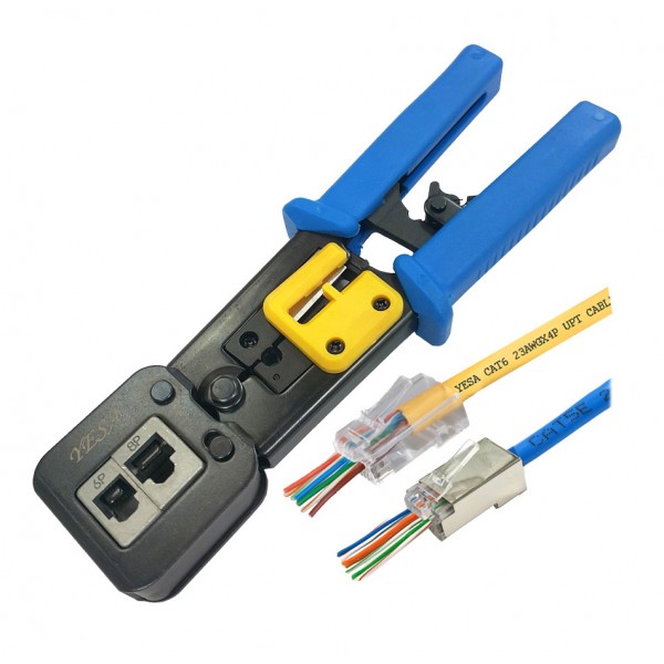 Pass-Thru Multi-Modular Plug Tool For Crimps, Strips & Cuts For modular plugs: 8P8C/RJ-45, 6P6C/RJ-12,6 P4C/RJ-11